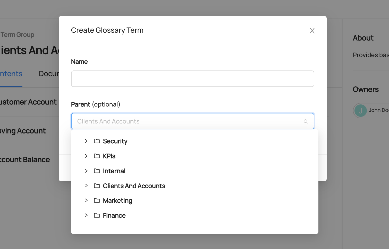 Note that the modal that pops up will automatically set the current Term Group you are in as the Parent. You can easily change this by selecting the input and navigating through your Glossary to find your desired Term Group. In addition, you could start typing the name of a Term Group to see it appear by searching. You can also leave this input blank in order to create a Term or Term Group with no parent.