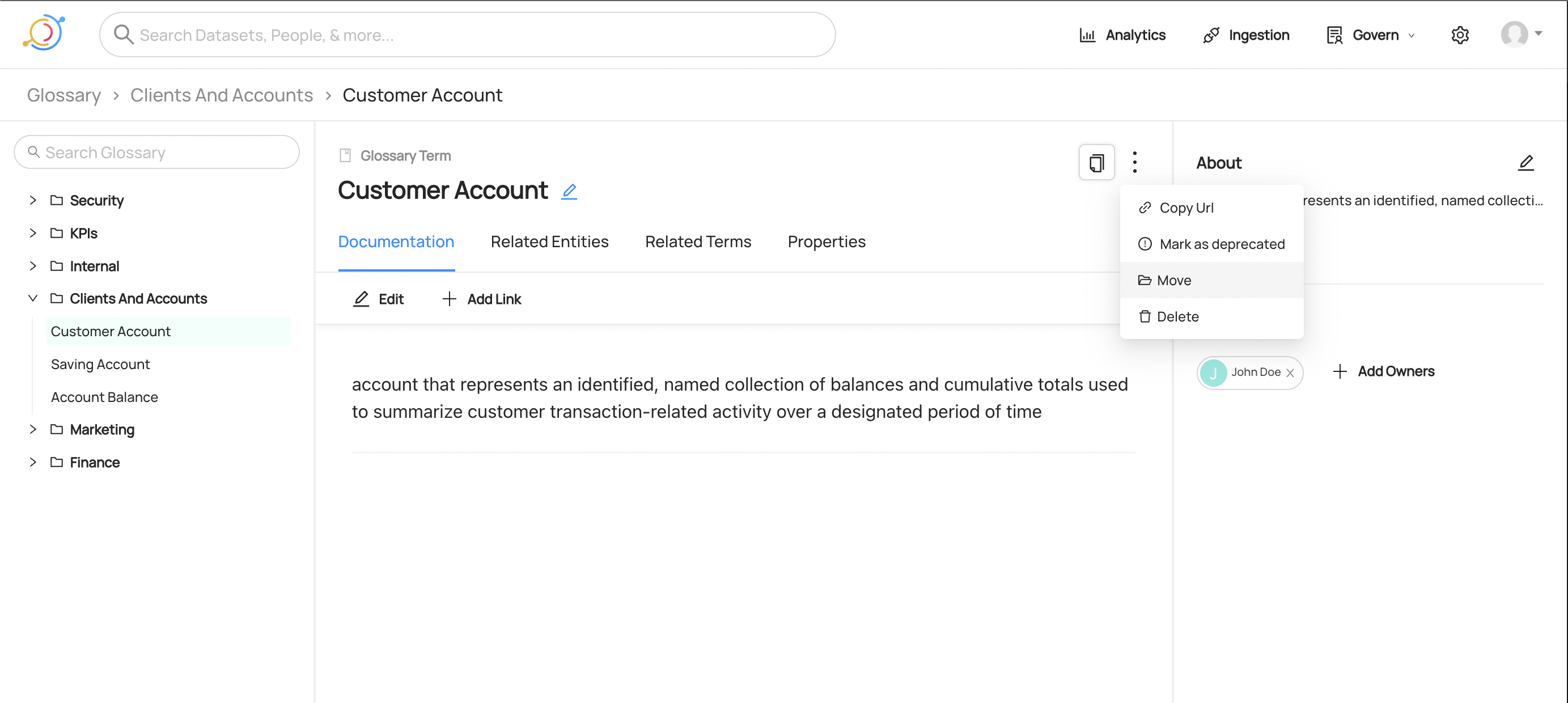 For Glossary Terms, you are also able to establish relationships between different Terms in the Related Terms tab. Here you can create Contains and Inherits relationships. Finally, you can view all of the entities that have been tagged with a Term in the Related Entities tab.