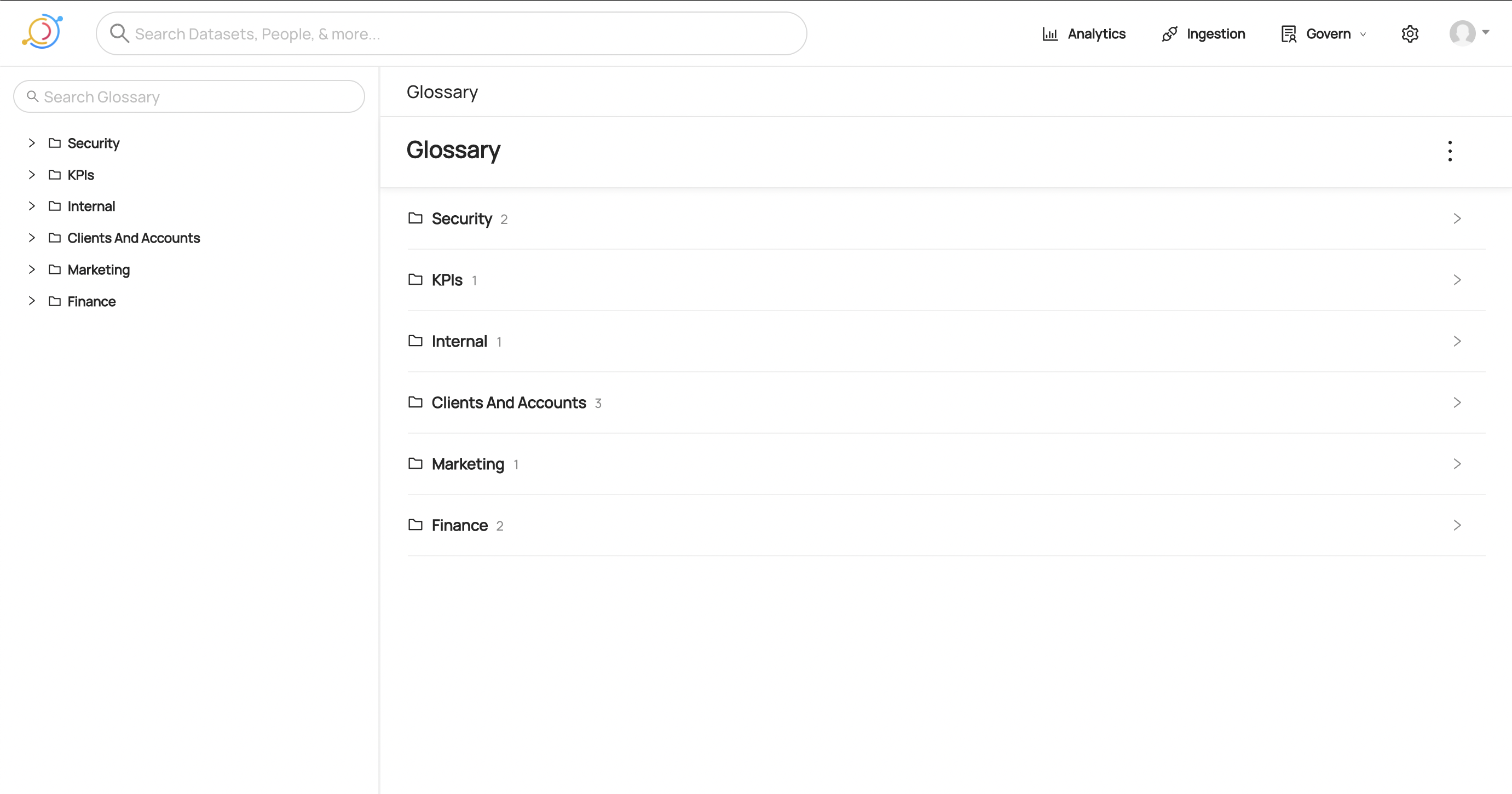 Once granted this privilege, you can access your Glossary by clicking the dropdown at the top of the page called Govern and then click Glossary: